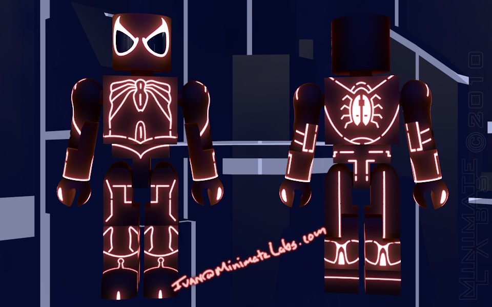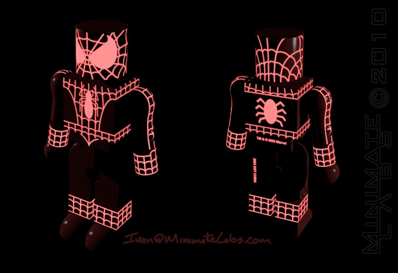 It's obvious that it doesn't match the version on the cover, but I wanted to see if it would work at all before devoting a lot of time to it. Looked good to me so I set to work making a new texture package. I knew that it wasn't easy to convert a 'realistic' costume into a Minimate version that is faithful to both. But I had no idea how difficult until I tried it myself. To this point, I've just replicated existing designs. To make me feel worse, this Tron Spidey is a simply a series of glowing lines. (I'm ignoring the pads and costume seams for Minimate reasons.) Ultimately I was able to generate this.