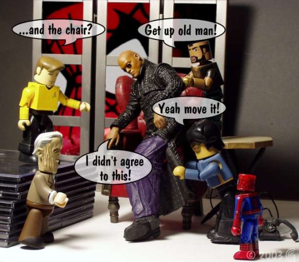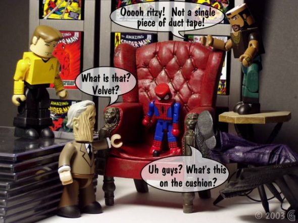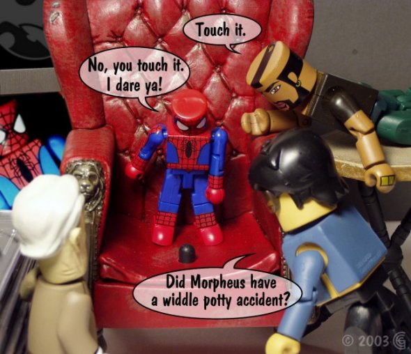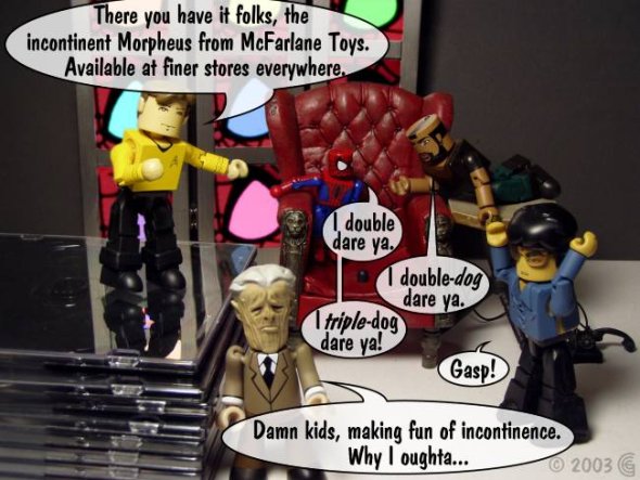 Oh, I've got nothing against McFarlane toys or their fans. This Morpheus figure was the last toy I purchased before making this toon. In fact he's still sitting on shelf in my toy room, being all intimidating and stuff.